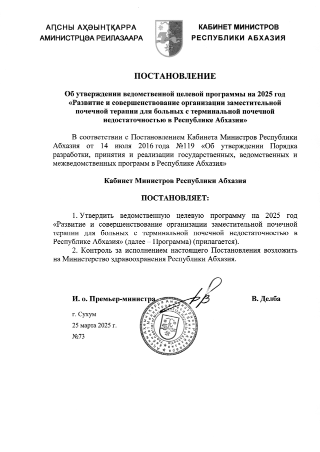 Постановление Кабинета Министров Республики Абхазия от 25.03.2025 №73 "Об утверждении ведомственной целевой программы на 2025 год <Развитие и совершенствование организации заместительной почечной терапии для больных с терминальной почечной недостаточностью в Республике Абхазия>"