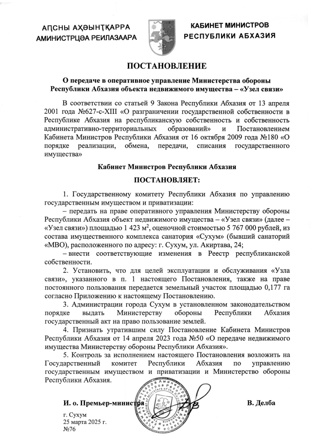 Постановление Кабинета Министров Республики Абхазия от 25.03.2025 №76 "О передаче в оперативное управление Министерства обороны Республики Абхазия объекта недвижимого имущества - <Узел связи>"