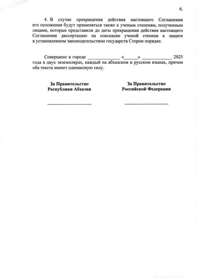 Постановление Кабинета Министров Республики Абхазия от 04.04.2025 №78 "О проведении переговоров и подписании Соглашения между Правительством Республики Абхазия и Правительством Российской Федерации о взаимном признании ученых степеней"