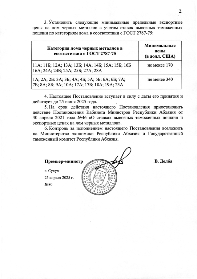 Постановление Кабинета Министров Республики Абхазия от 25.04.2025 №80 "О временных ставках вывозных таможенных пошлин и экспортных ценах на лом черных металлов"