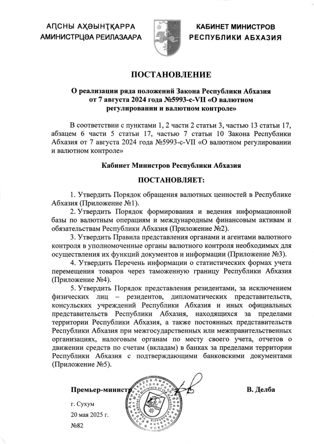 Постановление Кабинета Министров Республики Абхазия от 20.05.2025 №82 "О реализации ряда положений Закона Республики Абхазия от 7 августа 2024 года №5993-c-VII <О валютном регулировании и валютном контроле>"