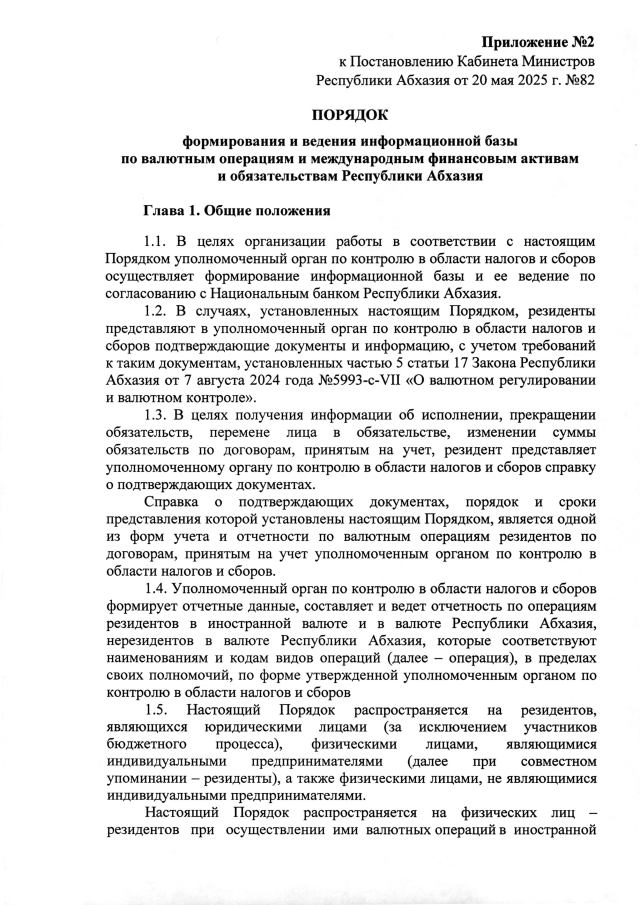 Постановление Кабинета Министров Республики Абхазия от 20.05.2025 №82 "О реализации ряда положений Закона Республики Абхазия от 7 августа 2024 года №5993-c-VII <О валютном регулировании и валютном контроле>"