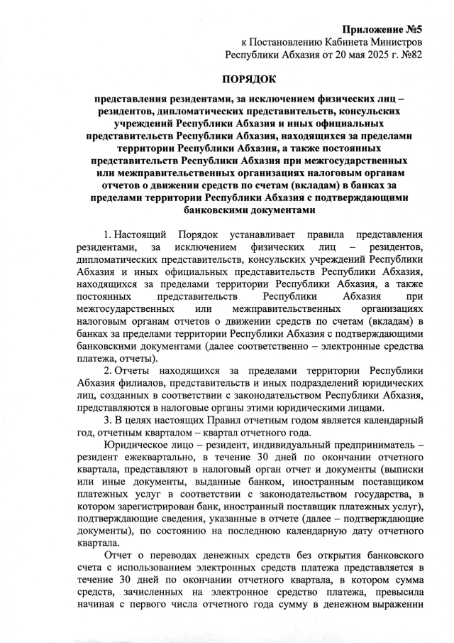 Постановление Кабинета Министров Республики Абхазия от 20.05.2025 №82 "О реализации ряда положений Закона Республики Абхазия от 7 августа 2024 года №5993-c-VII <О валютном регулировании и валютном контроле>"
