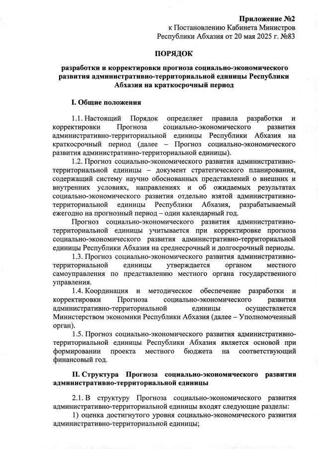 Постановление Кабинета Министров Республики Абхазия от 20.05.2025 №83 "О Порядке разработки и корректировки прогноза социально-экономического развития Республики Абхазия на краткосрочный период и об утверждении Порядка разработки и корректировки прогноза социально-экономического развития административно-территориальной единицы Республики Абхазия"