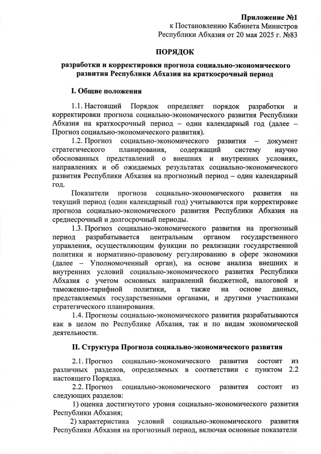 Постановление Кабинета Министров Республики Абхазия от 20.05.2025 №83 "О Порядке разработки и корректировки прогноза социально-экономического развития Республики Абхазия на краткосрочный период и об утверждении Порядка разработки и корректировки прогноза социально-экономического развития административно-территориальной единицы Республики Абхазия"