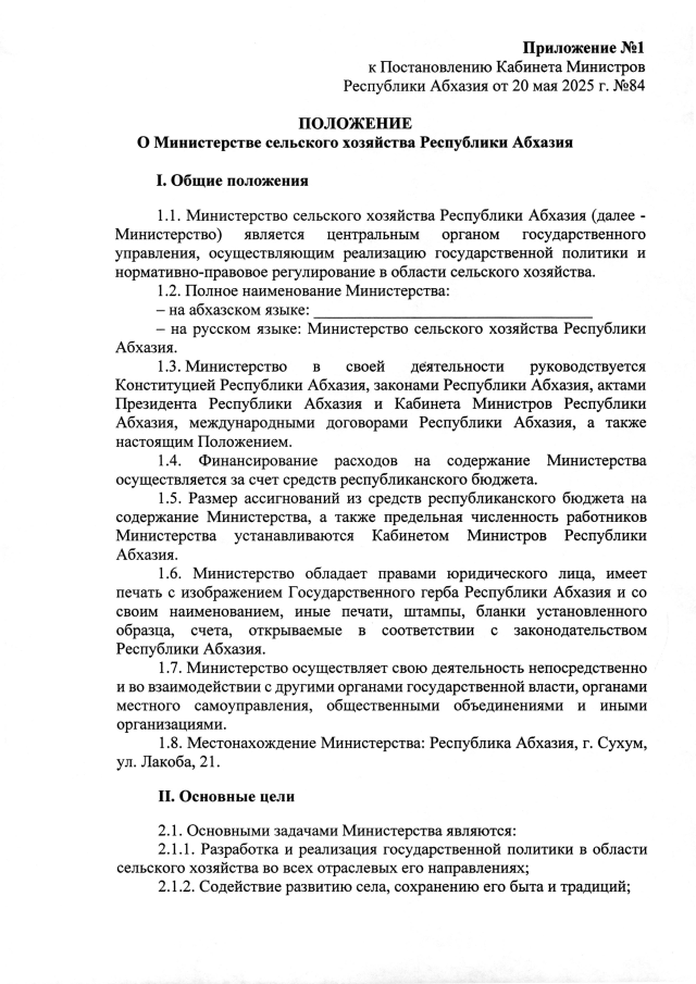 Постановление Кабинета Министров Республики Абхазия от 20.05.2025 №84 "Об утверждении положения о Министерстве сельского хозяйства Республики Абхазия"