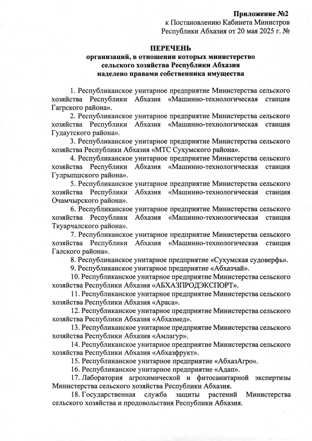 Постановление Кабинета Министров Республики Абхазия от 20.05.2025 №84 "Об утверждении положения о Министерстве сельского хозяйства Республики Абхазия"