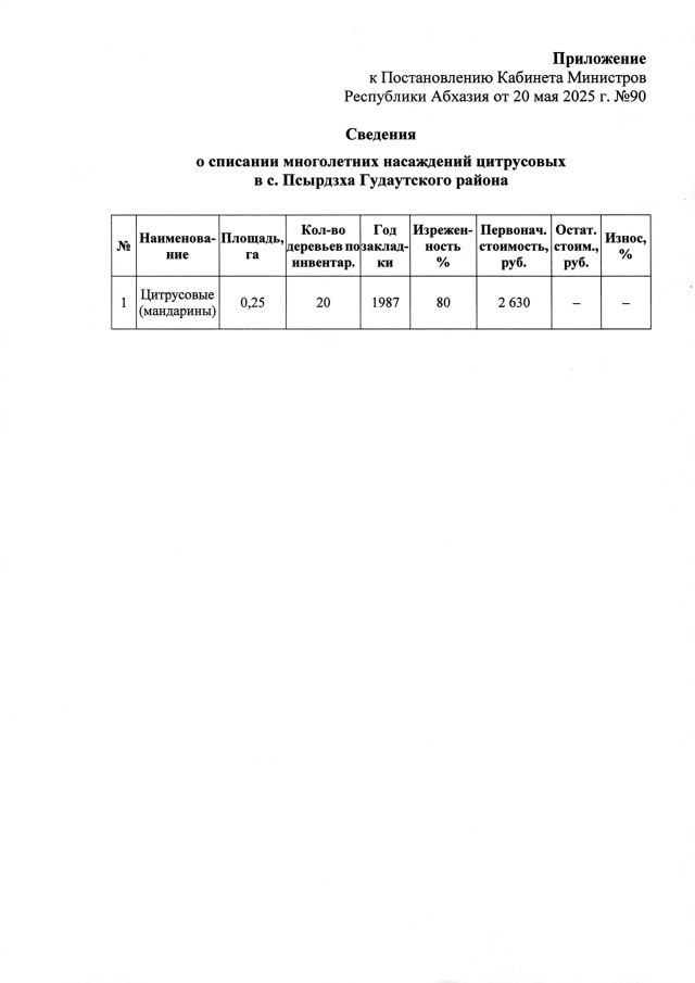 Постановление Кабинета Министров Республики Абхазия от 20.05.2025 №90 "О списании многолетних насаждений цитрусовых в с. Псырдзха Гудаутского района"