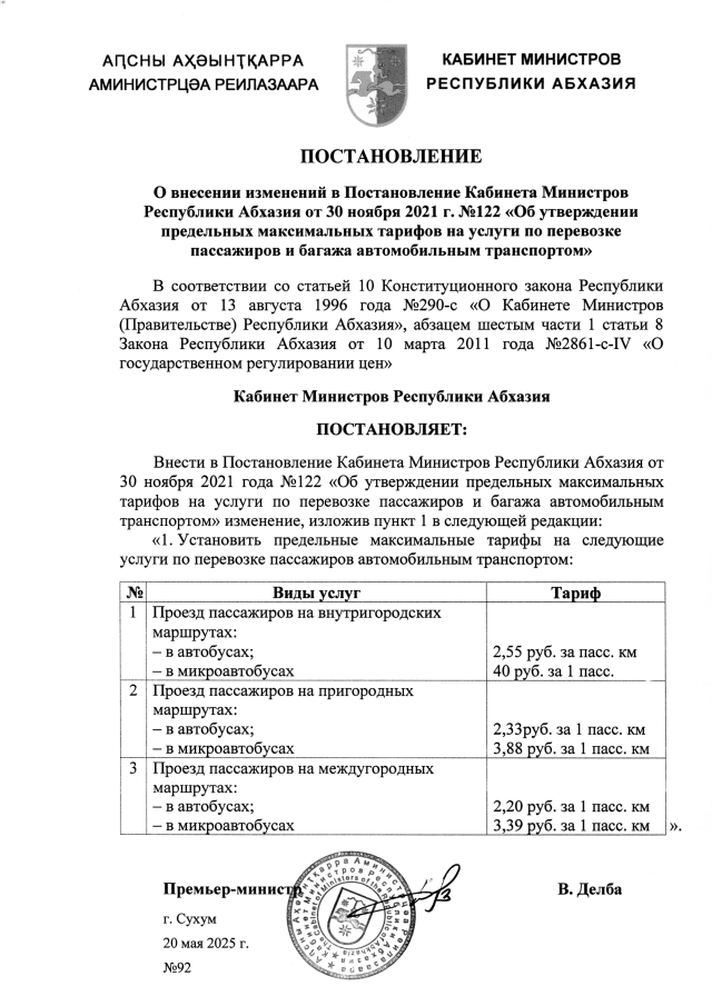 Постановление Кабинета Министров Республики Абхазия от 20.05.2025 №92 "О внесении изменений в Постановление Кабинета Министров Республики Абхазия от 30 ноября 2021 г. №122 <Об утверждении предельных максимальных тарифов на услуги по перевозке пассажиров и багажа автомобильным транспортом>"