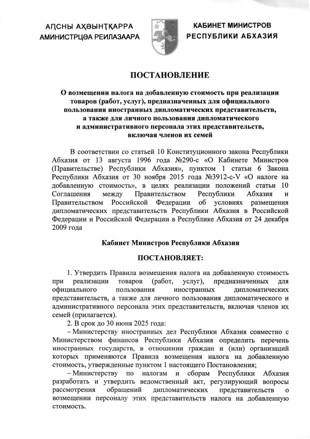 Постановление Кабинета Министров Республики Абхазия от 20.05.2025 №93 "О возмещении налога на добавленную стоимость при реализации товаров (работ, услуг), предназначенных для официального пользования иностранных дипломатических представительств,а также для личного пользования дипломатического и административного персонала этих представительств,включая членов их семей"