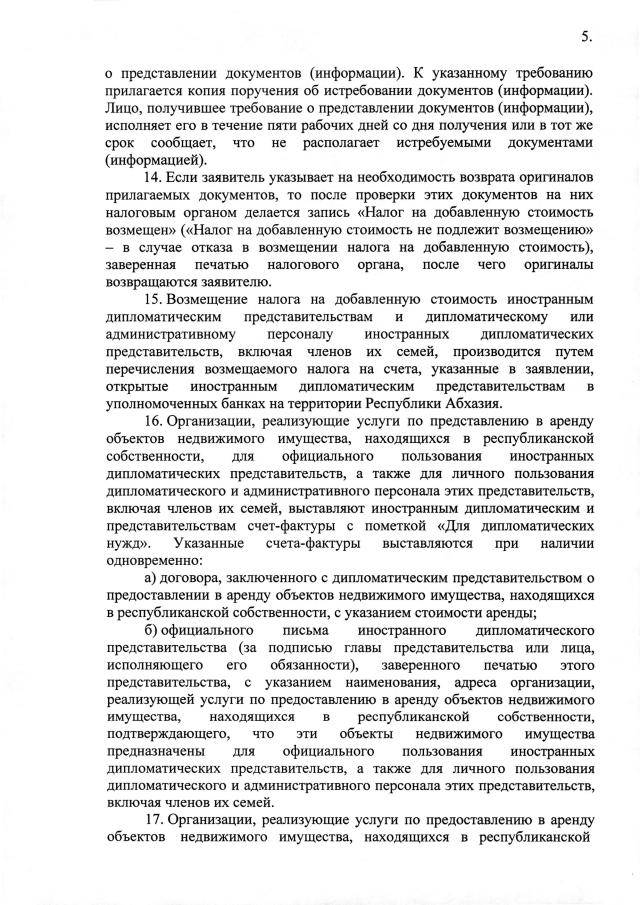 Постановление Кабинета Министров Республики Абхазия от 20.05.2025 №93 "О возмещении налога на добавленную стоимость при реализации товаров (работ, услуг), предназначенных для официального пользования иностранных дипломатических представительств,а также для личного пользования дипломатического и административного персонала этих представительств,включая членов их семей"