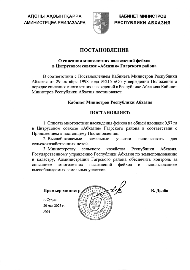 Постановление Кабинета Министров Республики Абхазия от 20.05.2025 №91 "О списании многолетних насаждений фейхоа в Цитрусовом совхозе <Абхазия> Гагрского района"
