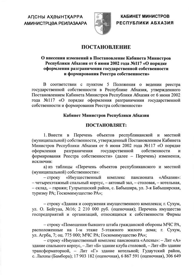 Постановление Кабинета Министров Республики Абхазия от 20.05.2025 №96 "О внесении изменений в Постановление Кабинета Министров Республики Абхазия от 6 июня 2002 года №117 <О порядке оформления разграничения государственной собственности и формирования Реестра собственности>"