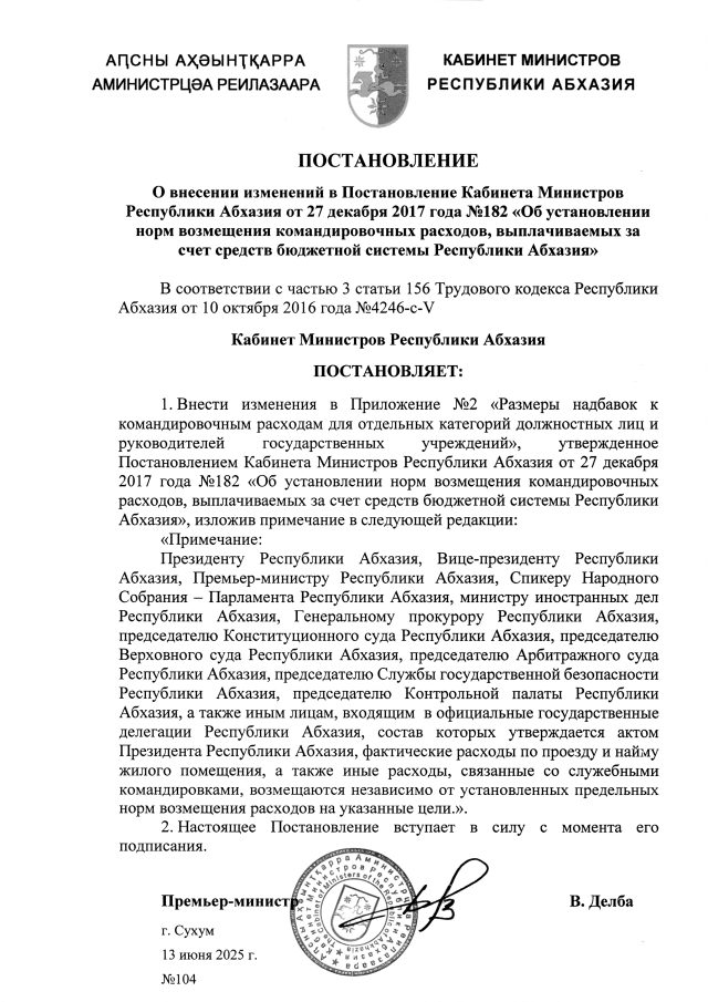 Постановление Кабинета Министров Республики Абхазия от 13.06.2025 №104 "О внесении изменений в Постановление Кабинета Министров Республики Абхазия от 27 декабря 2017 года №182 <Об установлении норм возмещения командировочных расходов, выплачиваемых за счет средств бюджетной системы Республики Абхазия>"