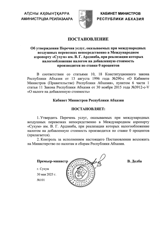 Постановление Кабинета Министров Республики Абхазия от 30.05.2025 №101 "Об утверждении Перечня услуг, оказываемых при международных воздушных перевозках непосредственно в Международном аэропорту <Сухум> им. В. Г. Ардзинба, при реализации которых налогообложение налогом на добавленную стоимость производится по ставке 0 процентов"
