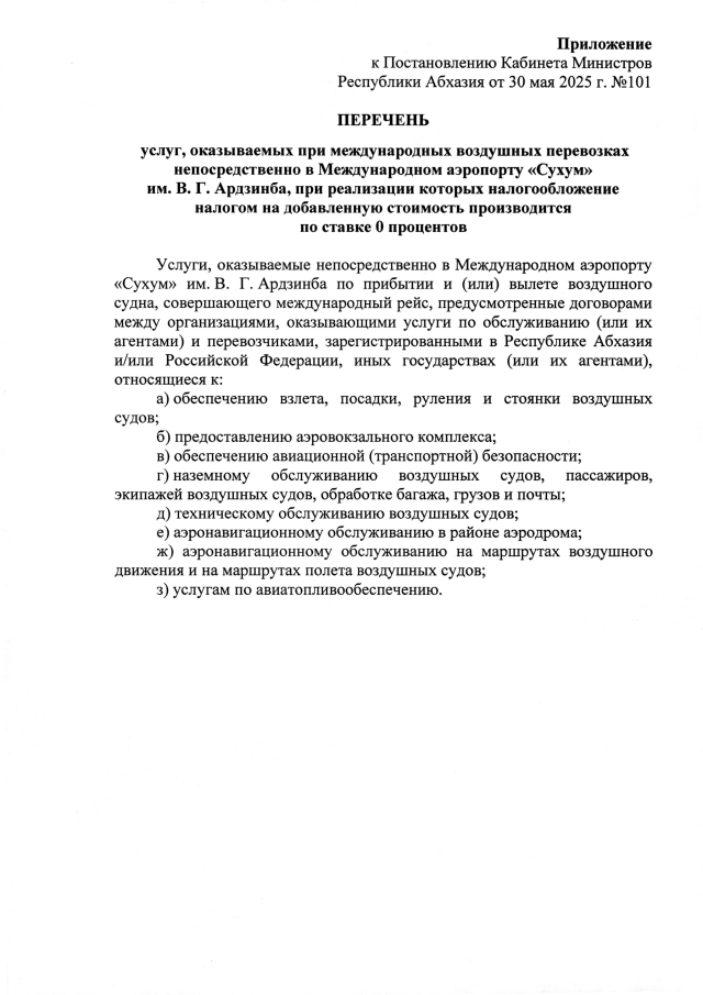 Постановление Кабинета Министров Республики Абхазия от 30.05.2025 №101 "Об утверждении Перечня услуг, оказываемых при международных воздушных перевозках непосредственно в Международном аэропорту <Сухум> им. В. Г. Ардзинба, при реализации которых налогообложение налогом на добавленную стоимость производится по ставке 0 процентов"
