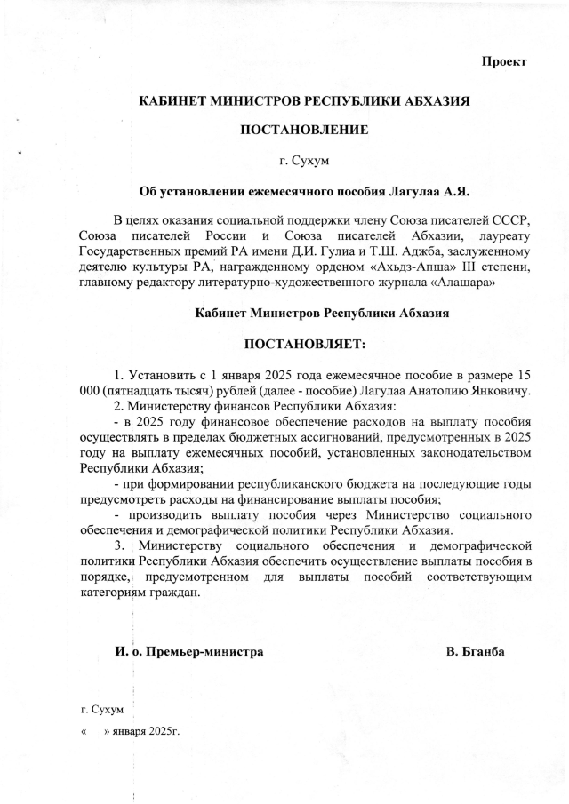 Постановление Кабинета Министров Республики Абхазия от 12.06.2025 №103 "Об установлении ежемесячного пособия Лагулаа А. Я."