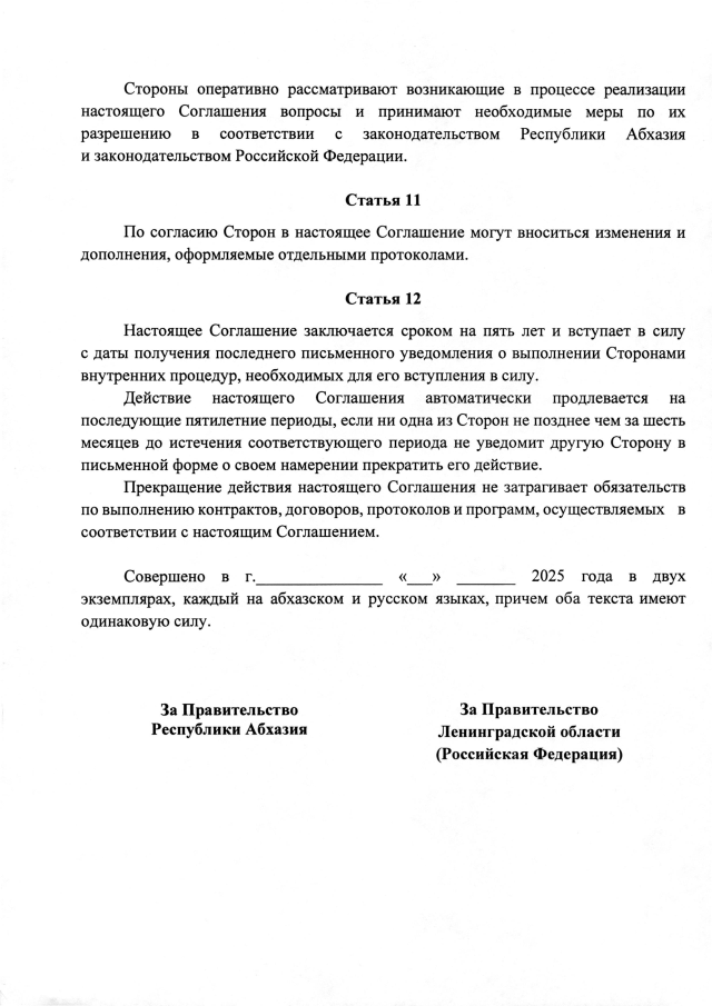 Постановление Кабинета Министров Республики Абхазия от 11.06.2025 №102 "О проведении переговоров и подписании Соглашения между Правительством Республики Абхазия и Правительством Ленинградской области (Российская Федерация)о сотрудничестве в торгово-экономической, научно-технической и социально-культурной сферах"