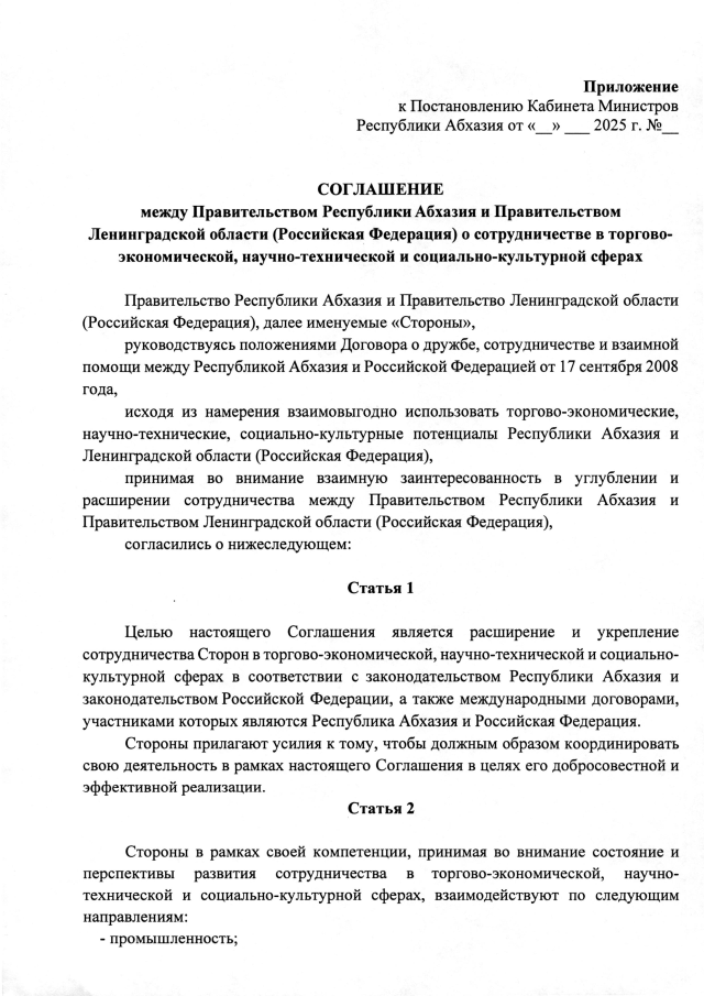 Постановление Кабинета Министров Республики Абхазия от 11.06.2025 №102 "О проведении переговоров и подписании Соглашения между Правительством Республики Абхазия и Правительством Ленинградской области (Российская Федерация)о сотрудничестве в торгово-экономической, научно-технической и социально-культурной сферах"