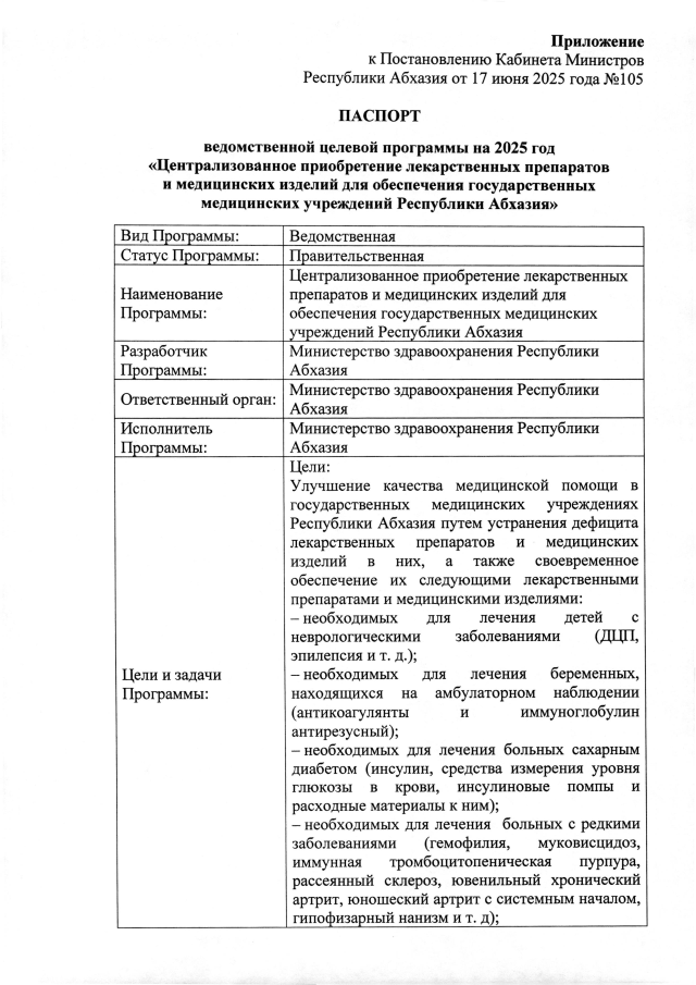 Постановление Кабинета Министров Республики Абхазия от 17.06.2025 №105 "Об утверждении ведомственной целевой программы на 2025 год <Централизованное приобретение лекарственных препаратов и медицинских изделий для обеспечения государственных медицинских учреждений Республики Абхазия>"