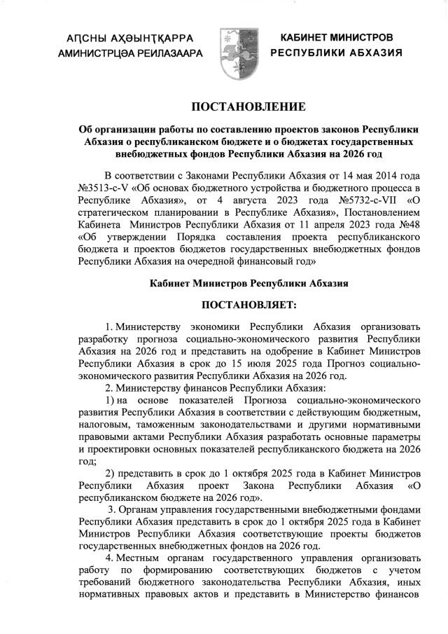 Постановление Кабинета Министров Республики Абхазия от 26.06.2025 №108 "Об организации работы по составлению проектов законов Республики Абхазия о республиканском бюджете и о бюджетах государственных внебюджетных фондов Республики Абхазия на 2026 год"