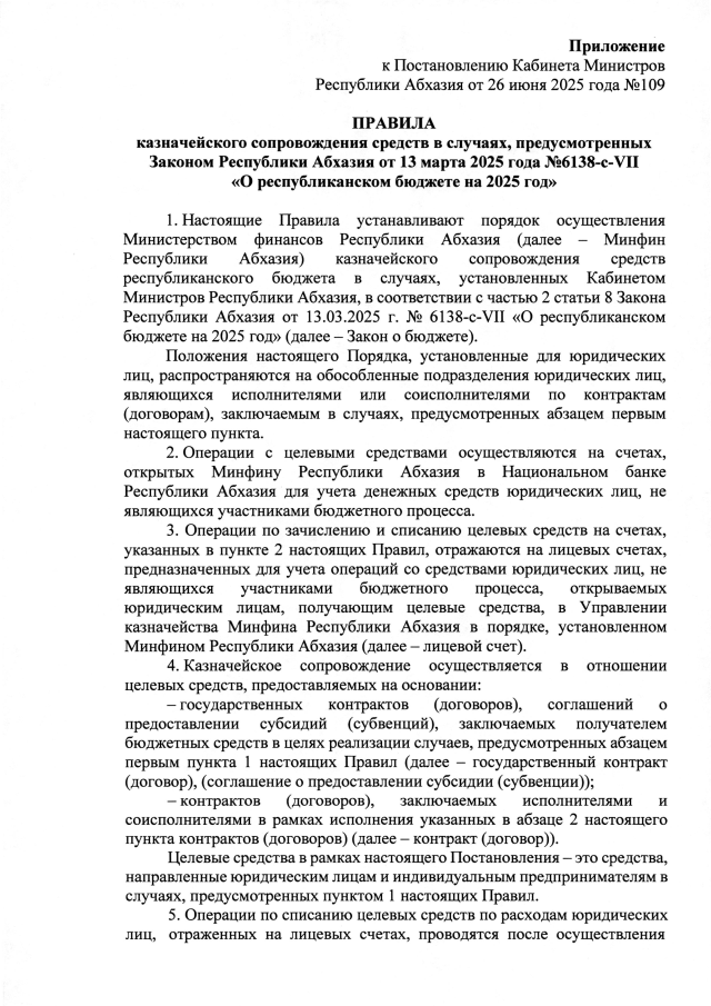 Постановление Кабинета Министров Республики Абхазия от 26.06.2025 №109 "Об утверждении Правил казначейского сопровождения средств в случаях, предусмотренных Законом Республики Абхазия от 13 марта 2025 года № 6138-с-VII <О республиканском бюджете на 2025 год>"