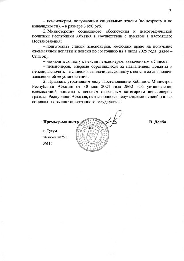 Постановление Кабинета Министров Республики Абхазия от 26.06.2025 №110 "Об установлении ежемесячной доплаты к пенсиям отдельным категориям пенсионеров, граждан Республики Абхазия, не являющихся получателями пенсий и иных социальных выплат иностранного государства"