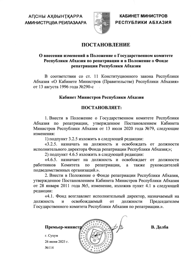 Постановление Кабинета Министров Республики Абхазия от 26.06.2025 №114 "О внесении изменений в Положение о Государственном комитете Республики Абхазия по репатриации и в Положение о Фонде репатриации Республики Абхазия"