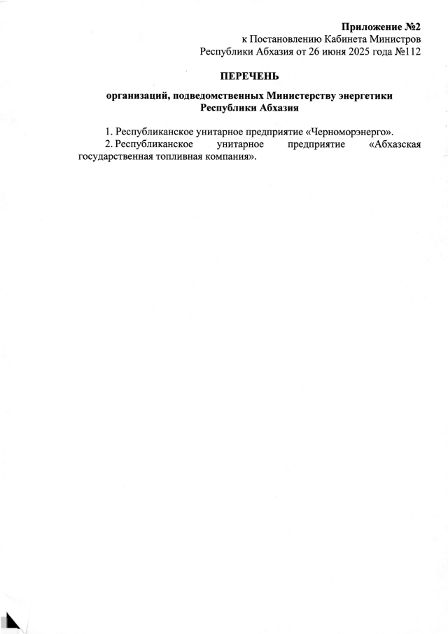 Постановление Кабинета Министров Республики Абхазия от 26.06.2025 №112 "Об утверждении Положения о Министерстве энергетики Республики Абхазия"