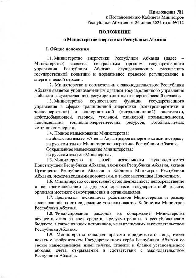 Постановление Кабинета Министров Республики Абхазия от 26.06.2025 №112 "Об утверждении Положения о Министерстве энергетики Республики Абхазия"