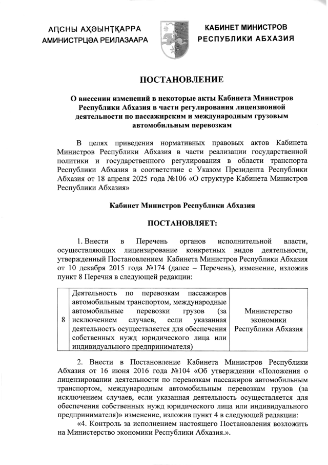Постановление Кабинета Министров Республики Абхазия от 26.06.2025 №115 "О внесении изменений в некоторые акты Кабинета Министров Республики Абхазия в части регулирования лицензионной деятельности по пассажирским и международным грузовым автомобильным перевозкам"