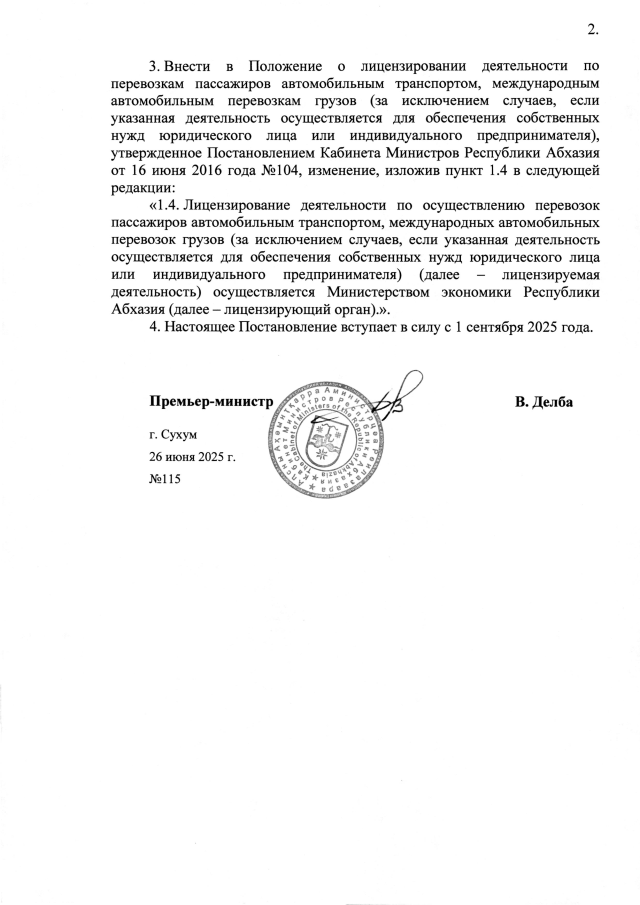 Постановление Кабинета Министров Республики Абхазия от 26.06.2025 №115 "О внесении изменений в некоторые акты Кабинета Министров Республики Абхазия в части регулирования лицензионной деятельности по пассажирским и международным грузовым автомобильным перевозкам"