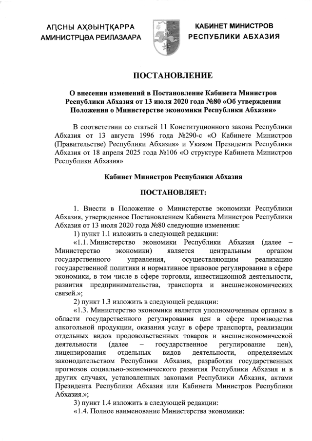 Постановление Кабинета Министров Республики Абхазия от 26.06.2025 №111 "О внесении изменений в Постановление Кабинета Министров Республики Абхазия от 13 июля 2020 года №80 <Об утверждении Положения о Министерстве экономики Республики Абхазия>"