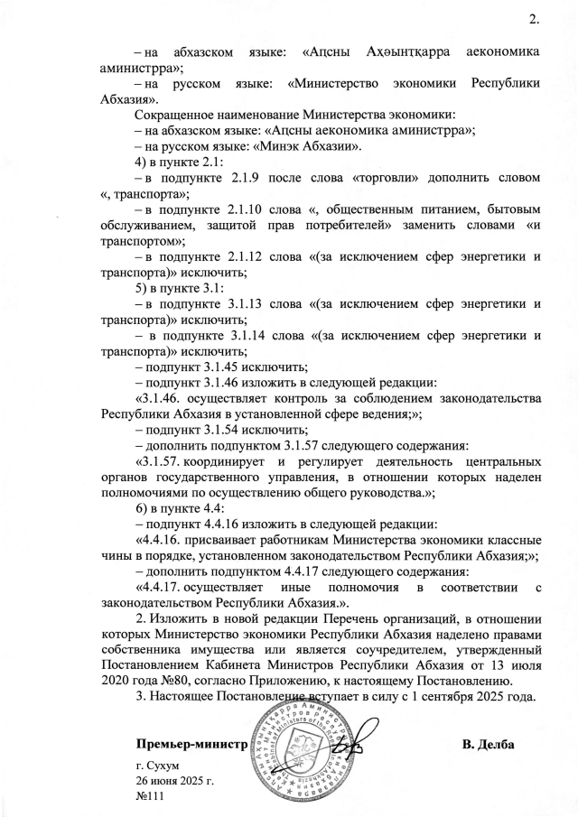 Постановление Кабинета Министров Республики Абхазия от 26.06.2025 №111 "О внесении изменений в Постановление Кабинета Министров Республики Абхазия от 13 июля 2020 года №80 <Об утверждении Положения о Министерстве экономики Республики Абхазия>"
