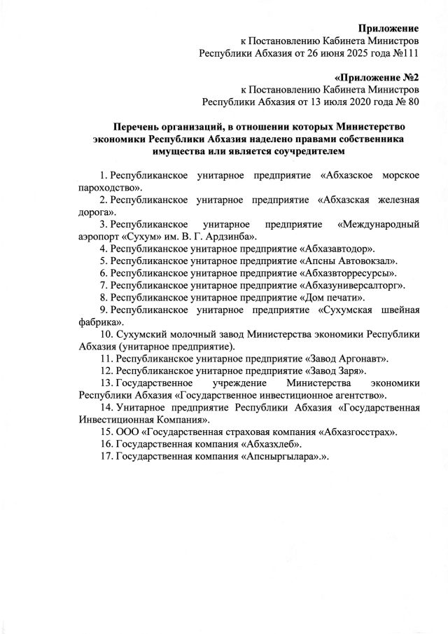 Постановление Кабинета Министров Республики Абхазия от 26.06.2025 №111 "О внесении изменений в Постановление Кабинета Министров Республики Абхазия от 13 июля 2020 года №80 <Об утверждении Положения о Министерстве экономики Республики Абхазия>"