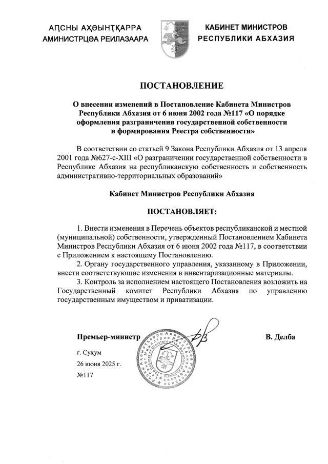 Постановление Кабинета Министров Республики Абхазия от 26.06.2025 №117 "О внесении изменений в Постановление Кабинета Министров Республики Абхазия от 6 июня 2002 года №117 <О порядке оформления разграничения государственной собственности и формирования Реестра собственности>"