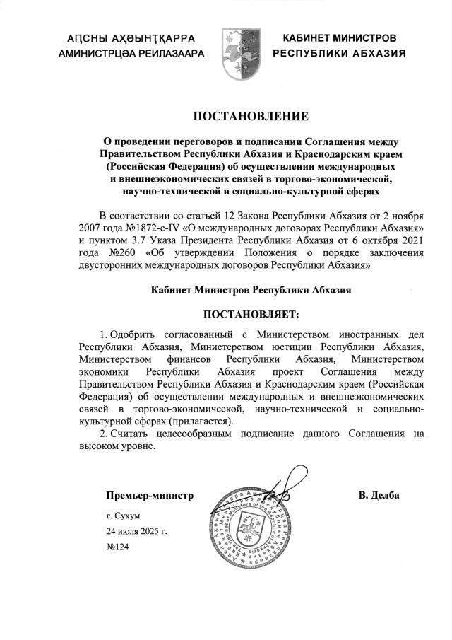 Постановление Кабинета Министров Республики Абхазия от 24.07.2025 №124 "О проведении переговоров и подписании Соглашения между Правительством Республики Абхазия и Краснодарским краем (Российская Федерация) об осуществлении международных и внешнеэкономических связей в торгово-экономической, научно-технической и социально-культурной сферах"
