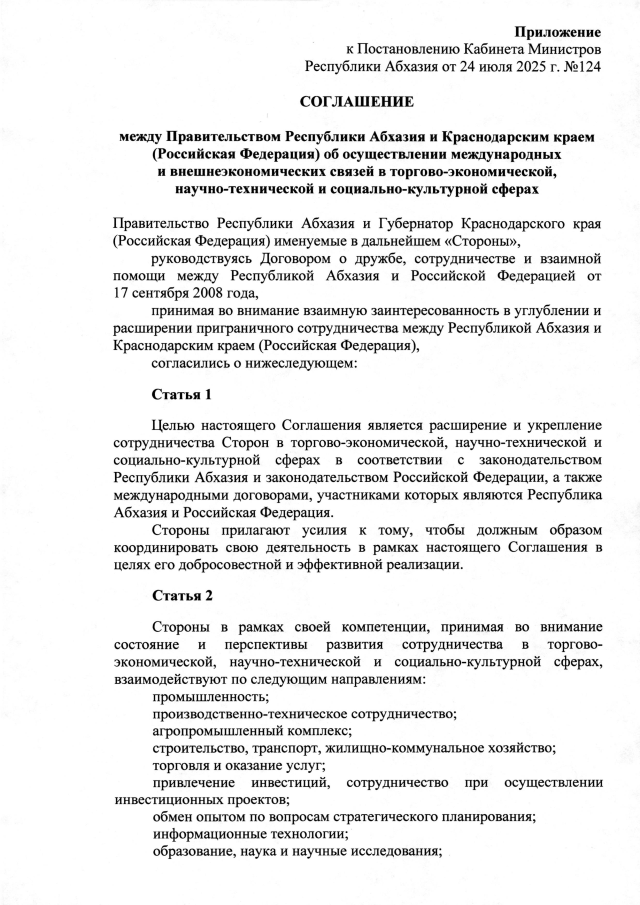 Постановление Кабинета Министров Республики Абхазия от 24.07.2025 №124 "О проведении переговоров и подписании Соглашения между Правительством Республики Абхазия и Краснодарским краем (Российская Федерация) об осуществлении международных и внешнеэкономических связей в торгово-экономической, научно-технической и социально-культурной сферах"