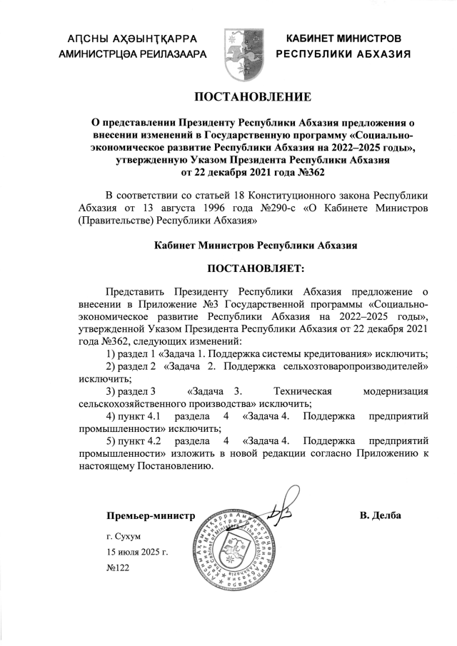 Постановление Кабинета Министров Республики Абхазия от 15.07.2025 №122 "О представлении Президенту Республики Абхазия предложения о внесении изменений в Государственную программу <Социально-экономическое развитие Республики Абхазия на 2022-2025 годы>, утвержденную Указом Президента Республики Абхазия от 22 декабря 2021 года №362"