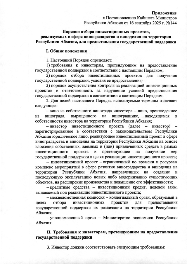Постановление Кабинета Министров Республики Абхазия от 16.09.2025 №144 "О государственной поддержке в 2025 году инвестиционных проектов в сфере развития виноградарства и виноделия в Республике Абхазия"
