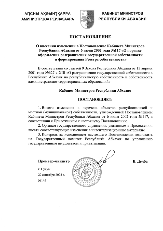 Постановление Кабинета Министров Республики Абхазия от 22.09.2025 №145 "О внесении изменений в Постановление Кабинета Министров Республики Абхазия от 6 июня 2002 года №117 <О порядке оформления разграничения государственной собственности и формирования Реестра собственности>"