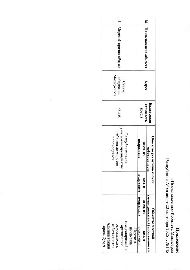 Постановление Кабинета Министров Республики Абхазия от 22.09.2025 №145 "О внесении изменений в Постановление Кабинета Министров Республики Абхазия от 6 июня 2002 года №117 <О порядке оформления разграничения государственной собственности и формирования Реестра собственности>"