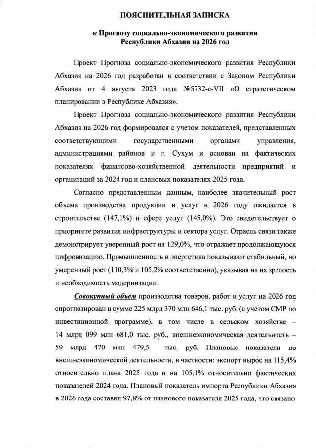 Постановление Кабинета Министров Республики Абхазия от 10.09.2025 №142 "Об утверждении Прогноза социально-экономического развития Республики Абхазия на 2026 год"