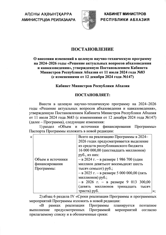 Постановление Кабинета Министров Республики Абхазия от 21.10.2025 №163 "О внесении изменений в целевую научно-техническую программу на 2024-2026 годы <Решение актуальных вопросов абхазоведения и кавказоведения>, утвержденную Постановлением Кабинета Министров Республики Абхазия от 11 июля 2024 года №83 (с изменениями от 12 декабря 2024 года №147)"