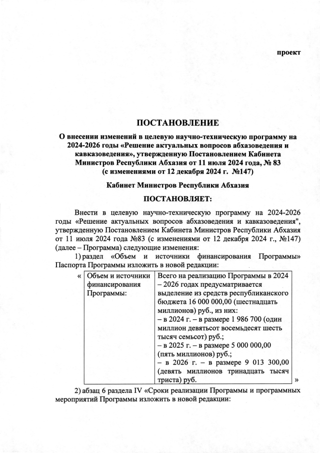 Постановление Кабинета Министров Республики Абхазия от 21.10.2025 №163 "О внесении изменений в целевую научно-техническую программу на 2024-2026 годы <Решение актуальных вопросов абхазоведения и кавказоведения>, утвержденную Постановлением Кабинета Министров Республики Абхазия от 11 июля 2024 года №83 (с изменениями от 12 декабря 2024 года №147)"