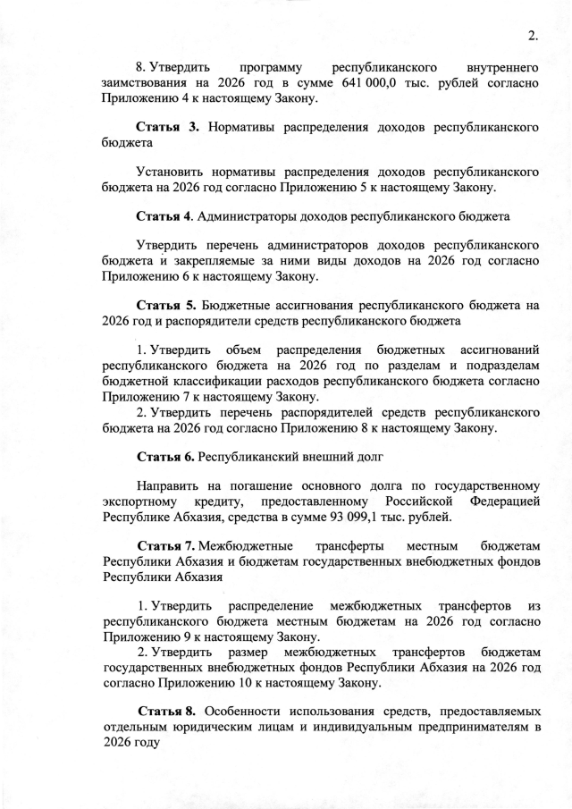 Постановление Кабинета Министров Республики Абхазия от 28.10.2025 №164 "О проекте Закона Республики Абхазия "О республиканском бюджете на 2026 год""