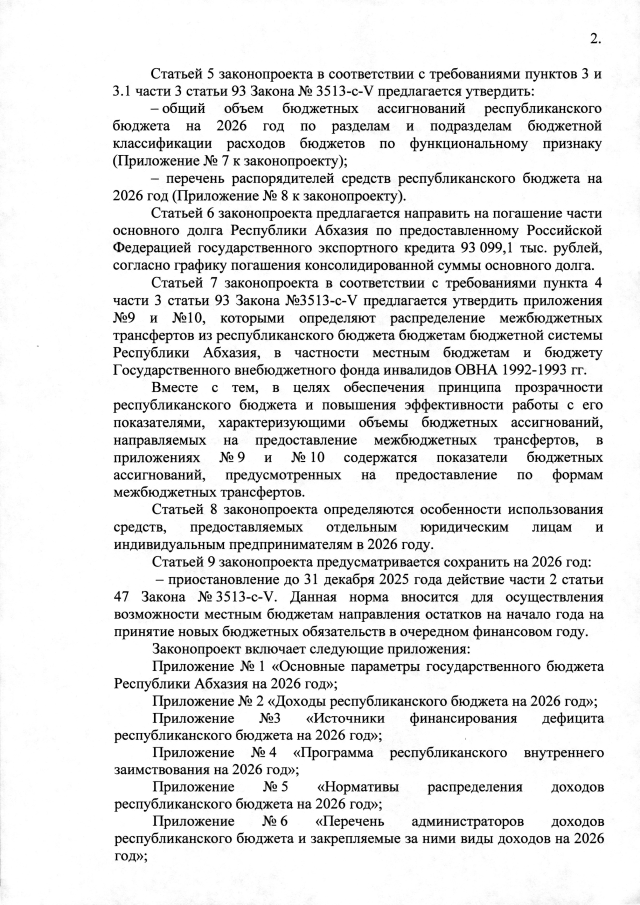 Постановление Кабинета Министров Республики Абхазия от 28.10.2025 №164 "О проекте Закона Республики Абхазия "О республиканском бюджете на 2026 год""