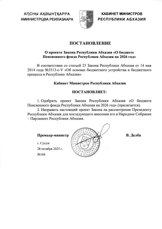 Постановление Кабинета Министров Республики Абхазия от 28.10.2025 №166 "О проекте Закона Республики Абхазия <О бюджете Пенсионного фонда Республики Абхазия на 2026 год>"