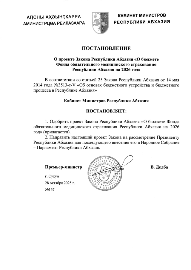 Постановление Кабинета Министров Республики Абхазия от 28.10.2025 №167 "О проекте Закона Республики Абхазия <О бюджете Фонда обязательного медицинского страхования Республики Абхазия на 2026 год>"