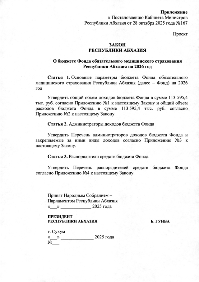 Постановление Кабинета Министров Республики Абхазия от 28.10.2025 №167 "О проекте Закона Республики Абхазия <О бюджете Фонда обязательного медицинского страхования Республики Абхазия на 2026 год>"